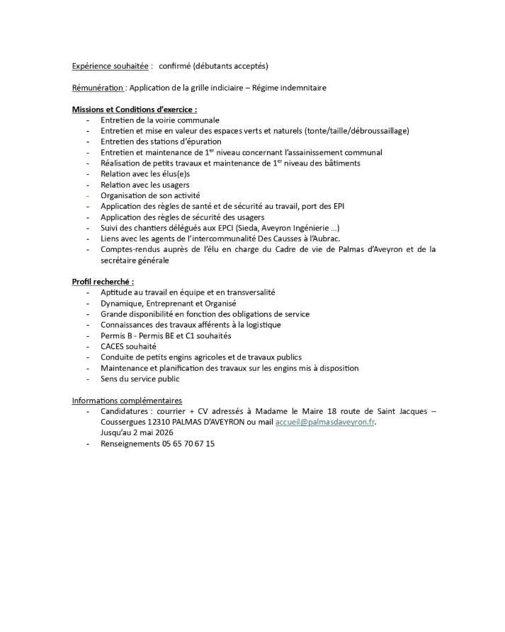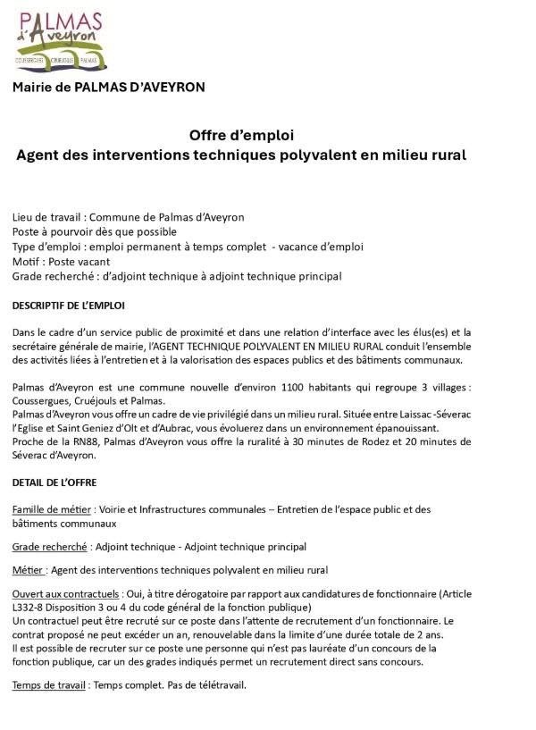 OFFRE D EMPLOI AGENT DES INTERVENTIONS TECHNIQUES